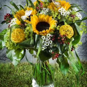Sunshine Arrangement with Gerberas, Lillies, Daisies, Roses, Carnations in an arrangement with Filler Greens